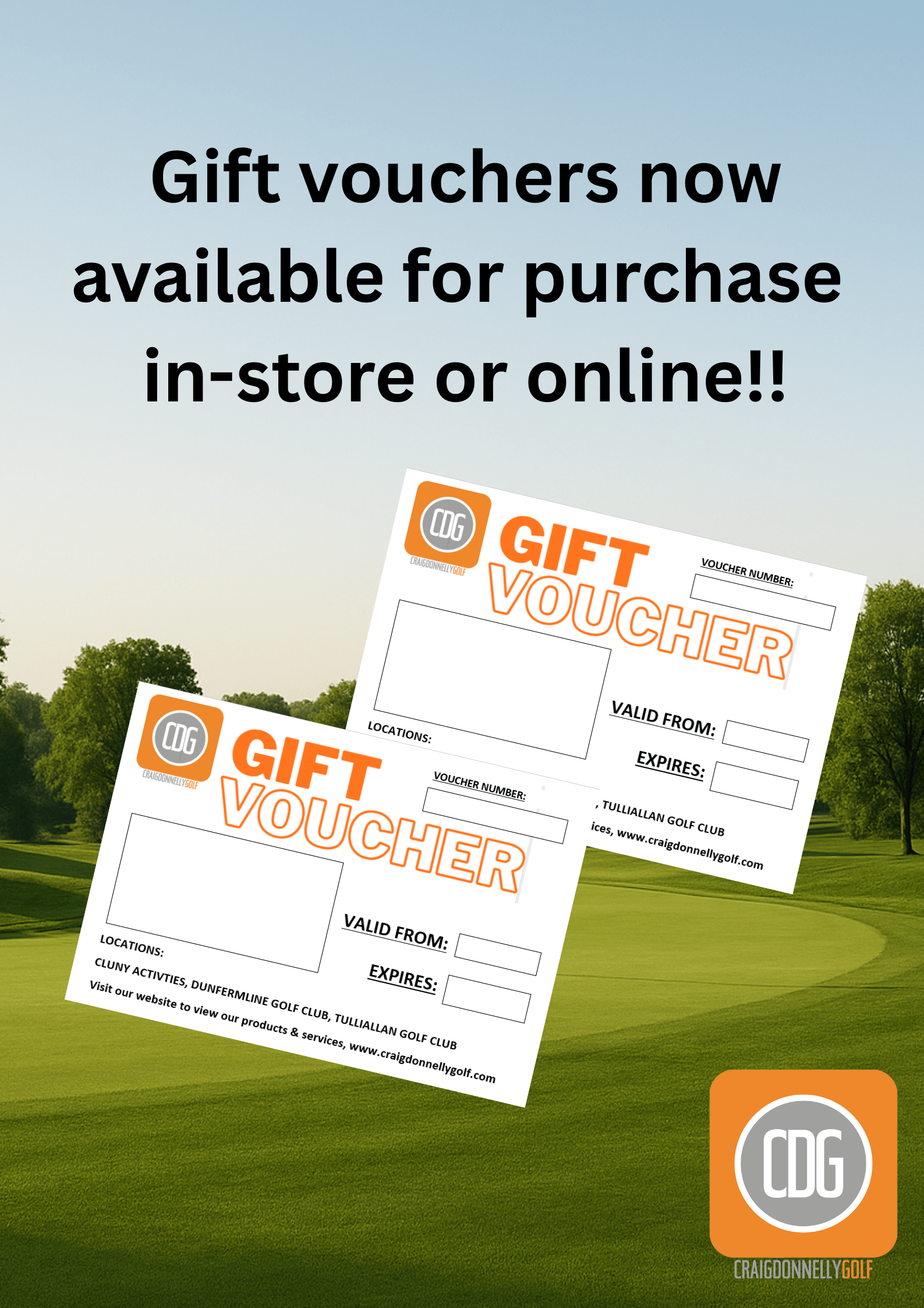 Struggling to find something for the golfer who has everything then a CDG Gift Voucher is perfect, you can choose between a monetary value of your choice or a Lesson voucher these are excellent if your unsure on what to get, Our gift vouchers can be purchased in our online store or at any 1 of our 3 stores and can be redeemed at any of them aswell. Our three stores at Cluny Activities Centre, Kirkcaldy, Dunfermline Golf Club, and Tulliallan Golf Club boast an extensive stock of the biggest brands in the game and our staff pride themselves on their PGA knowledge and customer service.
