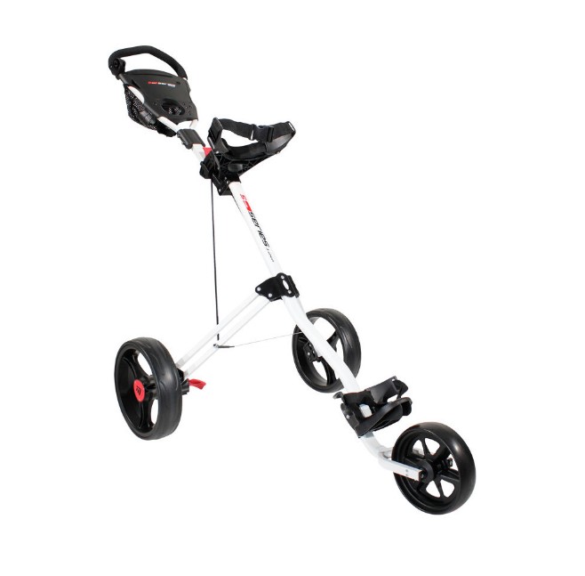 The Masters 5 Series 3 Wheel Push Cart is a 3 wheel golf cart with a sturdy frame and high load capacity. It can support the shape and weight of any golf cart bag which is held securely in place by strong webbing straps. Its’ easy to assemble as it slots into place in seconds for use, and is designed to glide over almost any terrain With an adjustble handle the height can be adjusted to suit every golfer, and the bab mount straps will hold any golf securely in place. Other features include a foot brake to hold you trolley firmly in place on hilly slopes, and a scorecard holder, . It also has a place to store your pencil, tees, and balls, as well as a rangefinder or mobile phone. Around the back of the handle there is plenty of space to store your balls in the strong mesh bag. An attachment for a universal umbrella holder (which can be purchased seperately) is also built into the handle. The Masters 5 Series 3 Wheel Push Golf Trolley Features: Quick-Lok folding system Adjustable height
