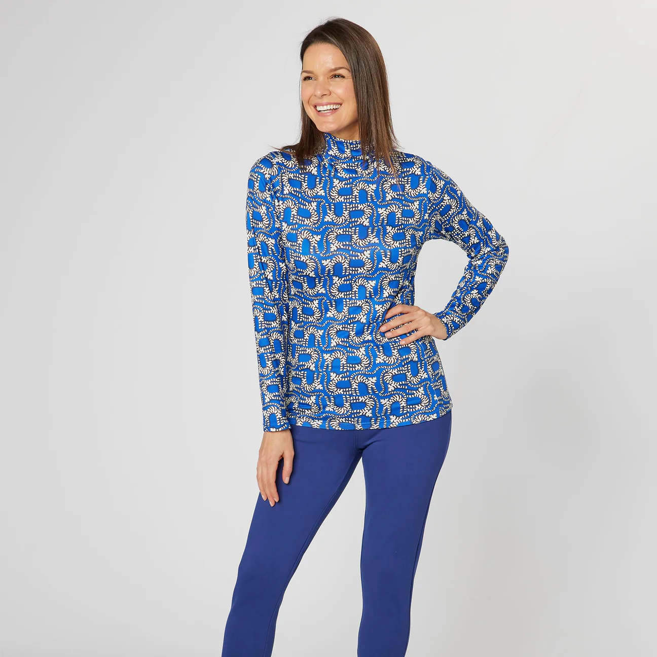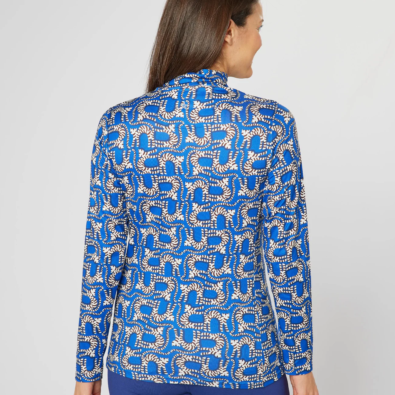 Embrace the cooler conditions on the golf course with the Swing Out Sister Shadow ladies golf roll neck., an essential top that is the perfect fusion of sleek, modern style and essential warmth, designed to keep you comfortable whatever the conditions. Constructed from a soft, high-stretch technical fabric that is both breathable & moisture wicking, the Shadow feels incredibly comfortable against the skin whilst the roll neck collar provides elevated levels of warmth and protection from chilly winds. Finished with a striking all-over seasonal pattern, the Shadow can be worn as a base layer or a standalone piece ensuring it will become a key addition to any cold-weather golf wardrobe this season